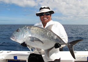 Suddenly, Rosie's rod loads up and line starts to peel off. With the drag screaming and me backing out of the reef the fight is on. We know immediately that it is a GT. Nothing fights like them. Deep powerful runs followed by massive head shakes and finally the long haul up with the fish using it's massive girth to fight you all the way to the top.