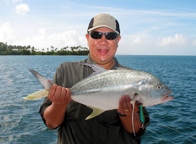I jump behind the wheel and the chase/fight is on. At first she thought it was foul hooked by the way the fish was fighting, but it turns out it was just a big GT. After a prolonged battle due to fish size and weather conditions we finally boat a big, fat and pregnant GT. We move quickly to minimize out of water time and snap a few pictures. Then with great fanfare she swims away strong.